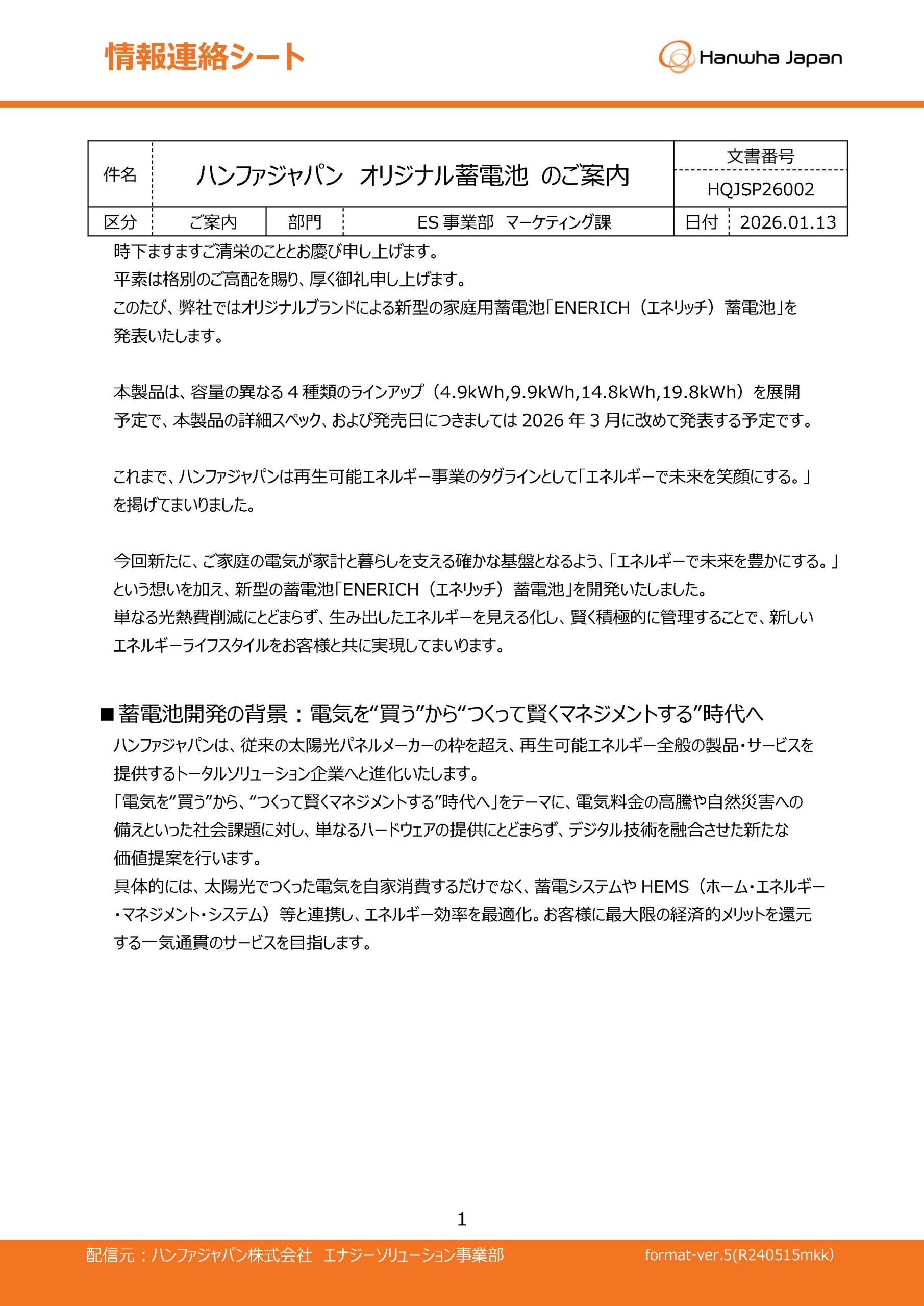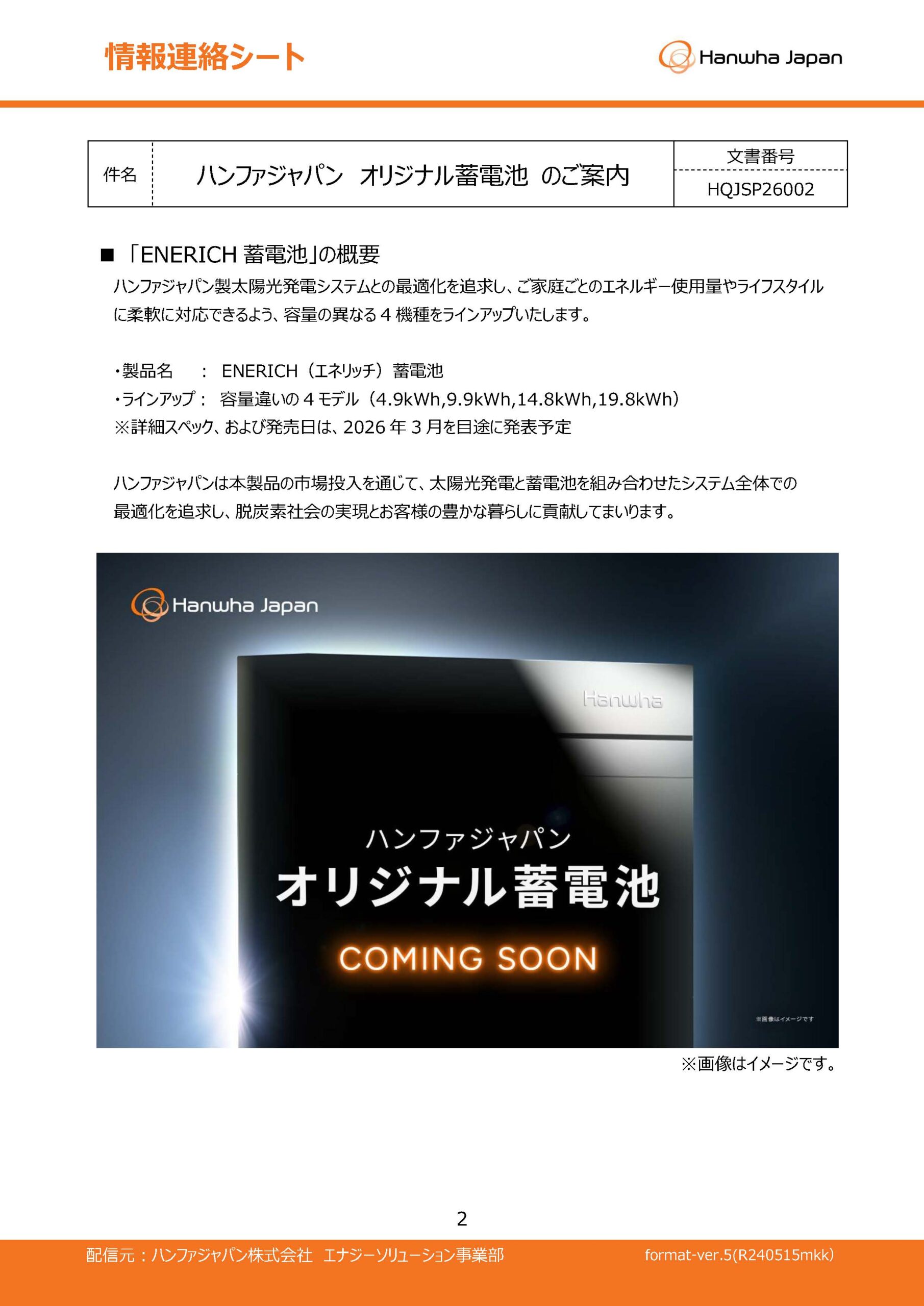 ハンファジャパンは、今春オリジナル蓄電池【ENERICH (エネリッチ)】を販売すると
