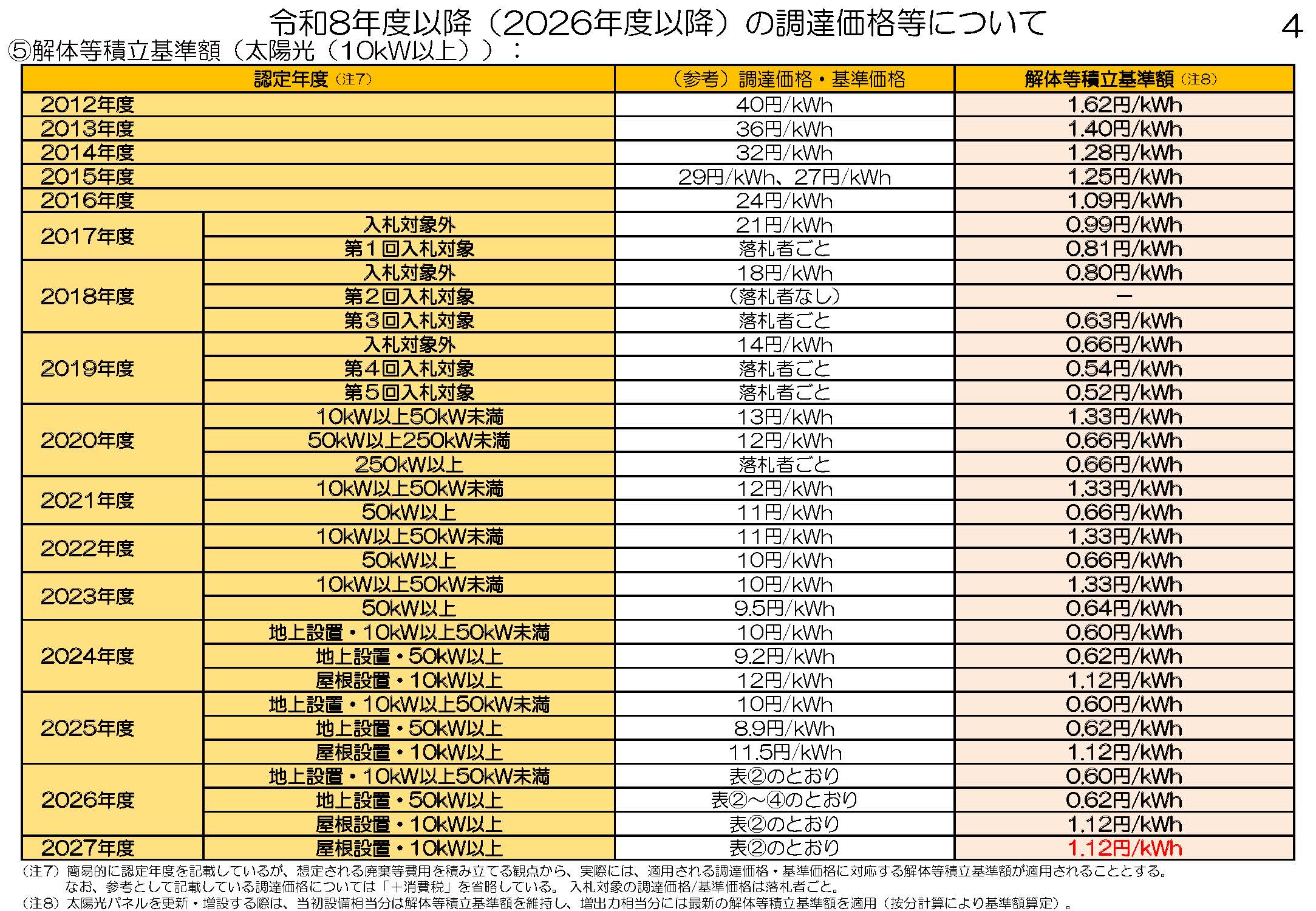 併せて、太陽光(10kW以上の)の解体等積立基準額も公表されました。