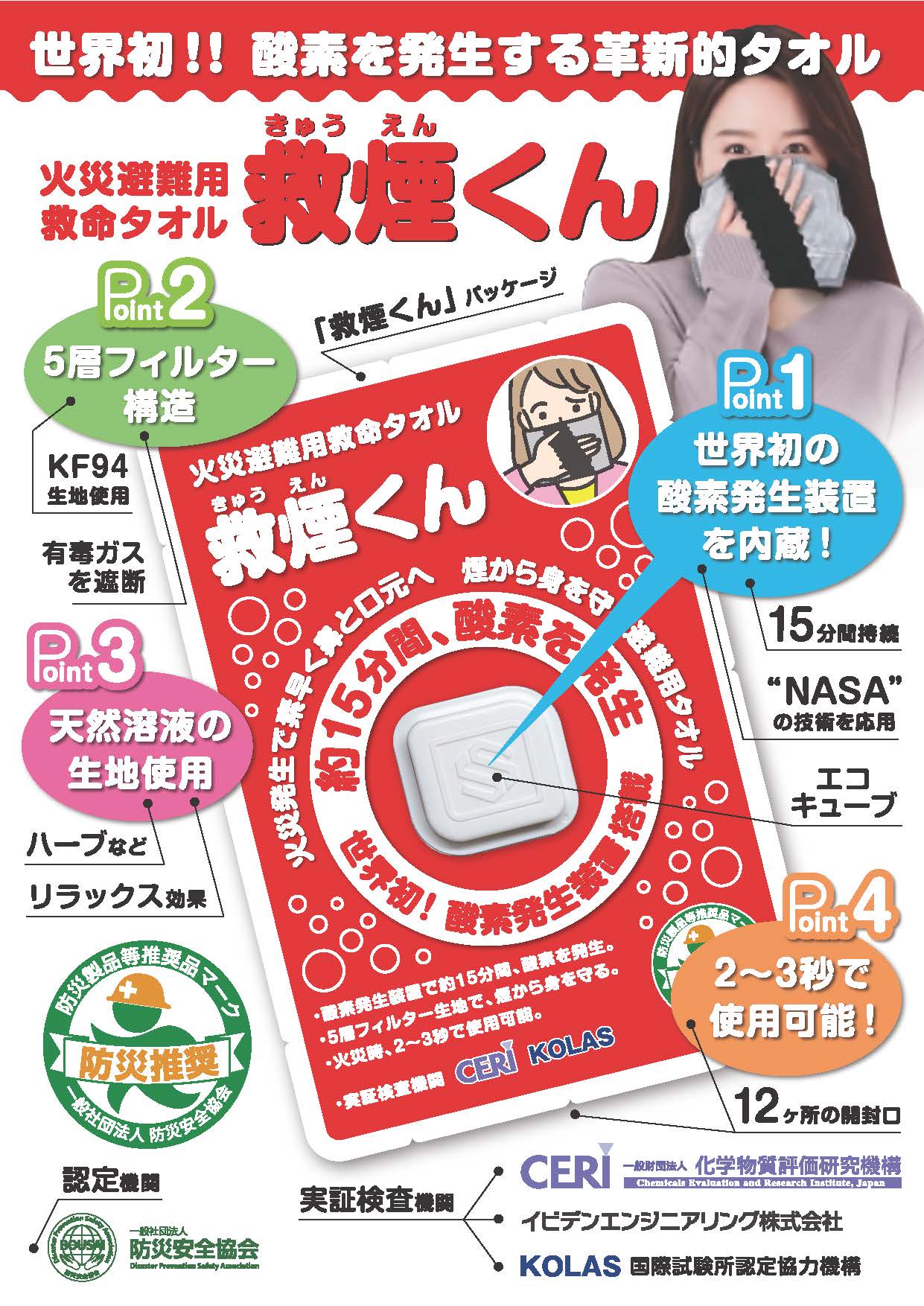 特に興味を示されたのは、酸素が15分間発生する火災避難用救命タオル救煙くんでした。BCP対策商品として、社員に1つ持たせることをご検討したい話されたお客さまもいらっしゃいました。